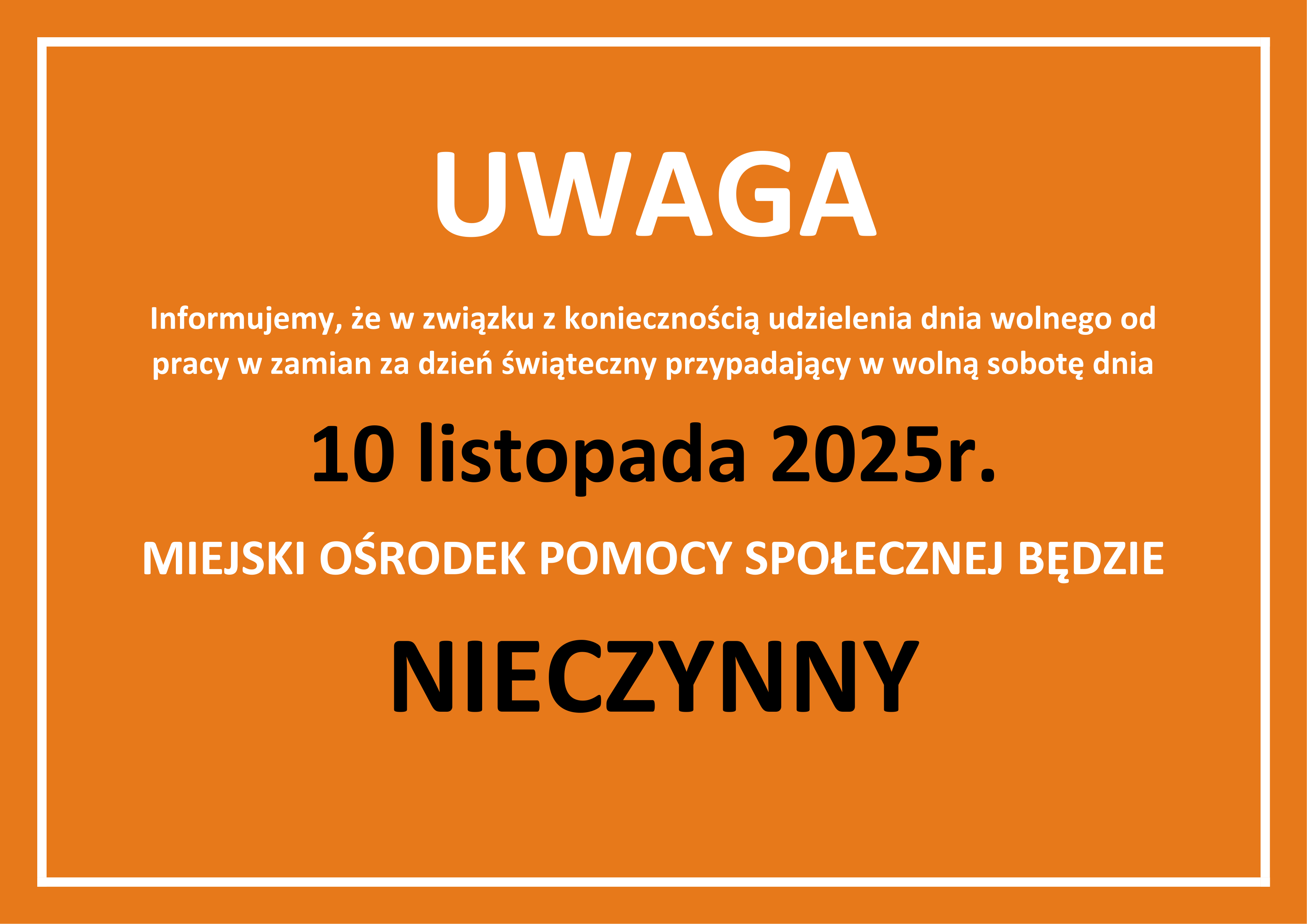 Informujemy, że w poniedziałek 10 listopada 2025r. Miejski Ośrodek Pomocy Społecznej w Stargardzie będzie nieczynny. Będzie to dzień wolny odbierany za Wszystkich Świętych przypadające w sobotę. Za utrudnienia przepraszamy.